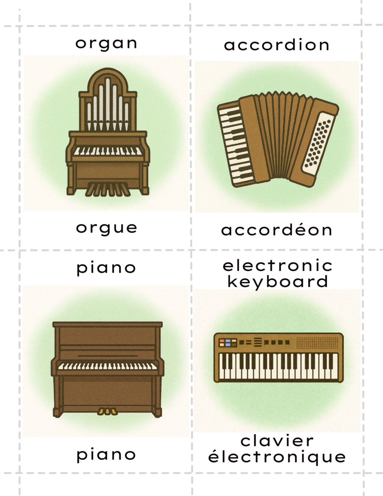 Available in English, French and bilingual FR/EN. A Full color flash cards set of 30 musical instruments divided in 4 families by color codes. A set of wind, strings, keyboards and percussions.